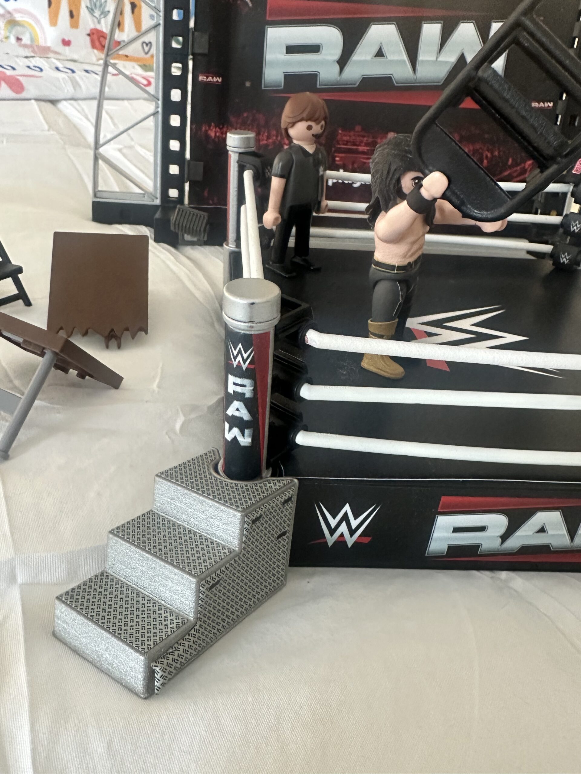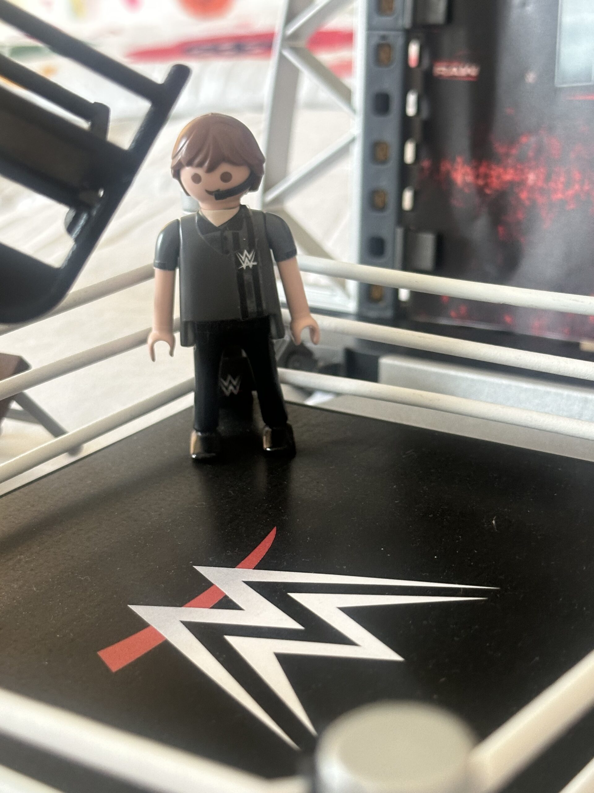 Toy Fair coverage begins offsite this year, not in a showroom, but in…an APPARTMENT?! That’s right, I’m standing in a bedroom of skyrise appartment 4 blocks from the Javitts Center and Playmobil’s new WWE line is on the bed in front of me, while their new Barbie prototypes sit on the dresser behind me. (NOTE: THE BARBIE ITEMS WERE PROTOTYPES AND SUBJECT TO FINAL APPROVAL SO NO PHOTOGRAPHY WAS ALLOWED) So, how did this come about? Well, Playmobil’s PR agency, Carve Communications, created this as part of a new PR Venture they call Carve-X. Carve-X is designed to show the products in the environment they are most likely to be used in. I must admit that I can’t help but think in the back of my head that I might be arrested for home invasion at any moment, I push those thoughts to the back of my head and focus on the product. Because this is the only place at Toy Fair to see Playmobil’s new WWE line, and here it is in front of me.