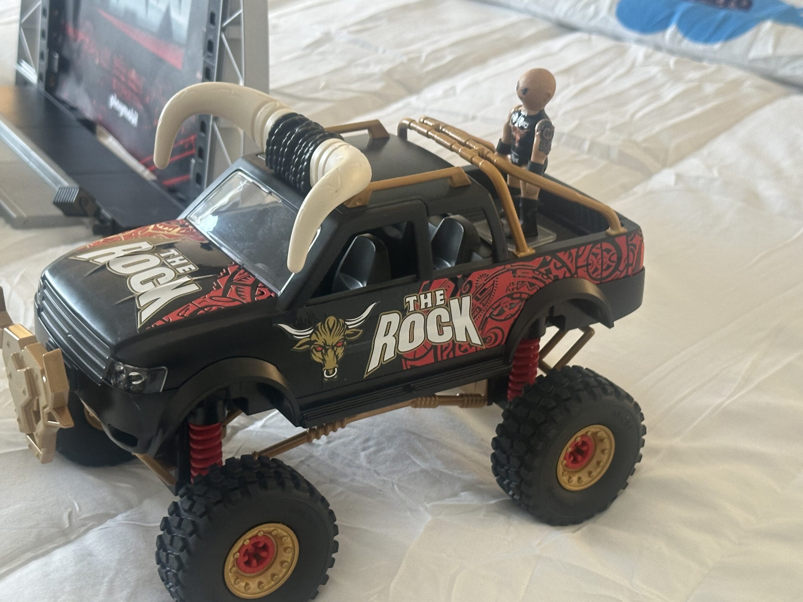 The line consists of individual figures, a vehicle and a playset. As with most of their pop culture offerings, Playmobil has perfectly translated the look and signature features of the various WWE SuperStars into their signature figure style. SuperStars shown include Hulk Hogan, Rhea Ripley, Cody Rhodes, John Cena, Triple H, “Stone Cold” Steve Austin and Roman Reigns. Also shown was a Brahma Bull Monster Truck, which comes with a figure of, who else, but the Rock. Finally, the centerpiece of the line is a massive RAW Arena Set, which includes a ring, with RAW ring post and ring skirt graphics, as well an entryway with a huge screen that features a RAW graphic and a small ramp. Also included are a breakable table and a couple of chairs. The ring has white elastic ropes. Figures of Seth “Freakin” Rollins and CM Punk, as well as a cameraman, with a camera accessory, and a referee in the current referee shirt, which is making it’s first appearance in any toy line.