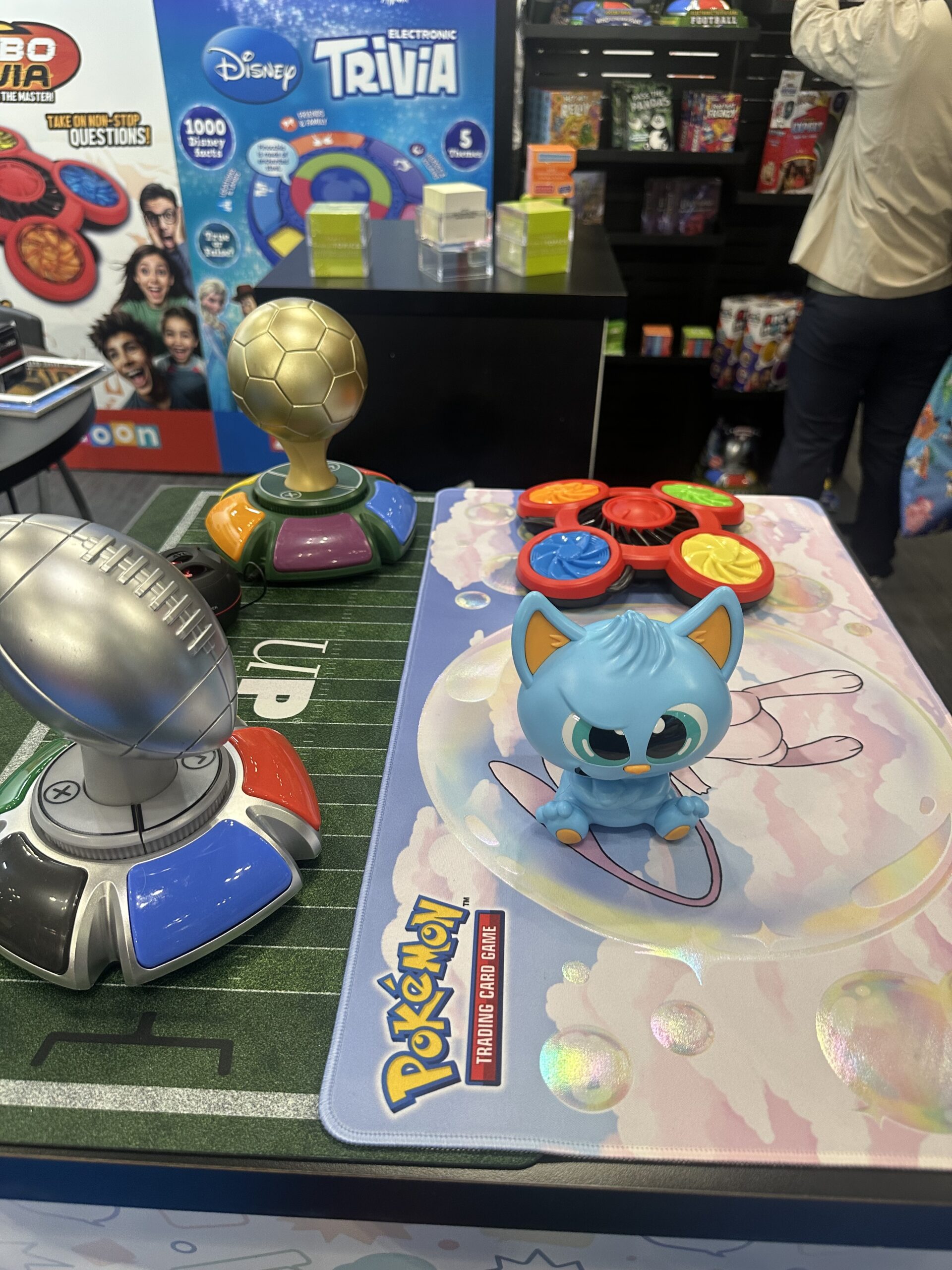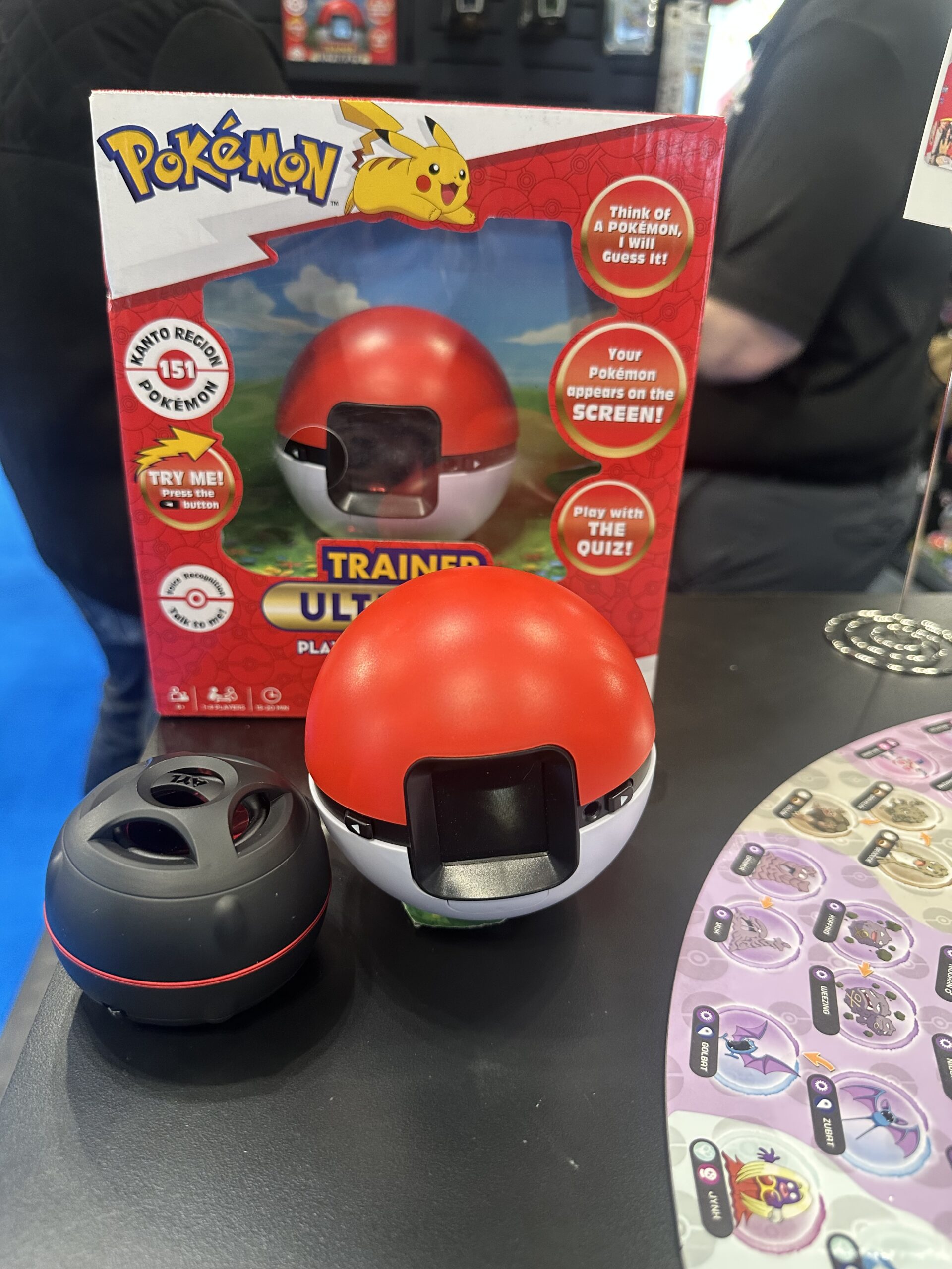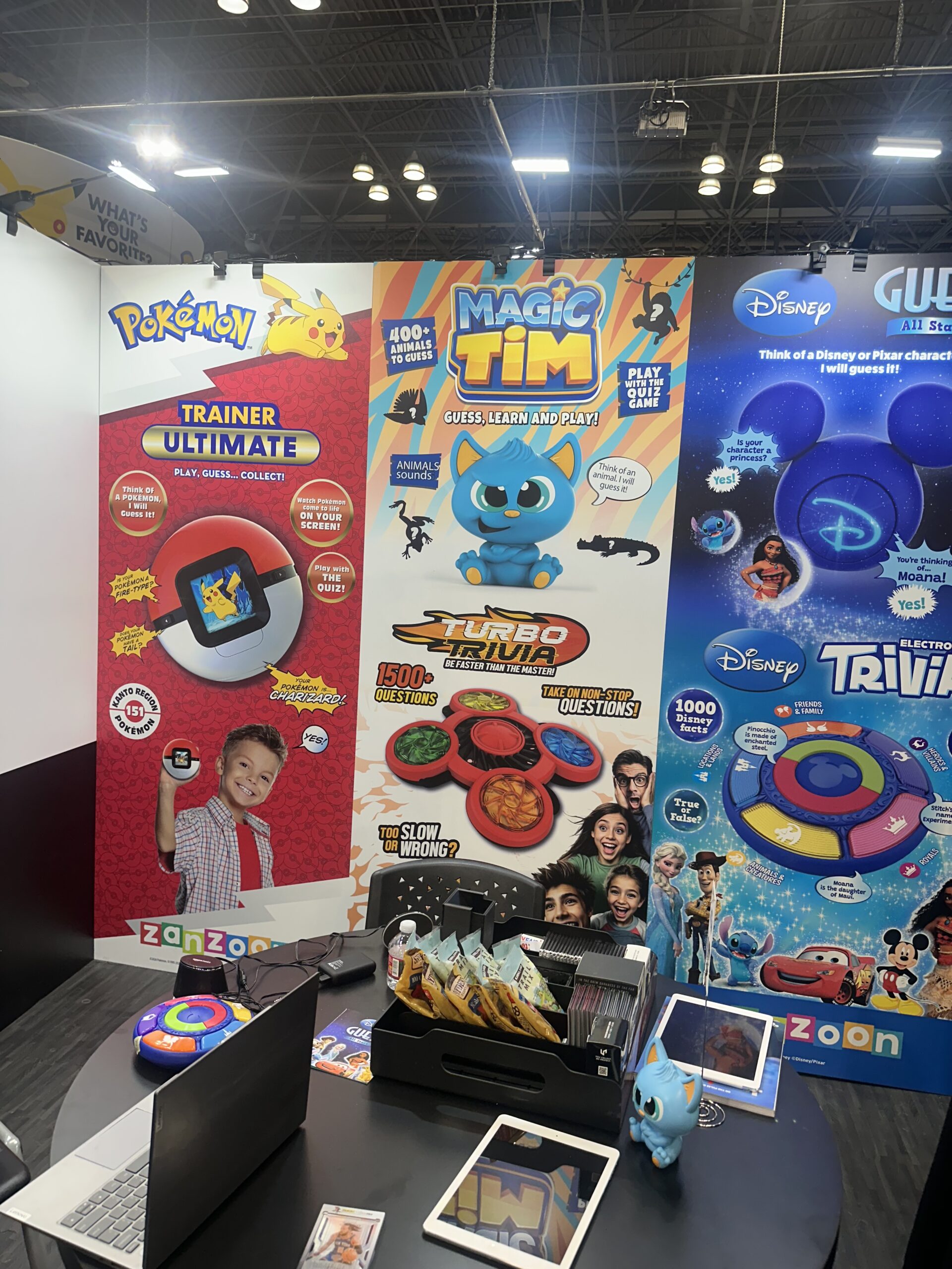 Ultra Pro, a company previously known primarily for Trading Card supplies, such as binders and sleeves, has grown by leaps and bounds over the last few years, ever branching out into board games. We stopped by their Toy Fair booth to see their latest offerings, which included several electronic trivia games, focusing on different sports, such as soccer and football, as well as a “2 minute trivia challenge”, that features questions from different categories. In addition, they are expanding their popular “Guessing Game” line to include a revised Pokémon Guessing Game, shaped like a pokeball with a new color screen, as well as an animal guessing game and a Disney Character guessing game.